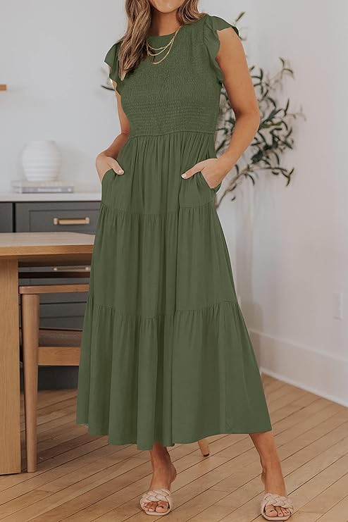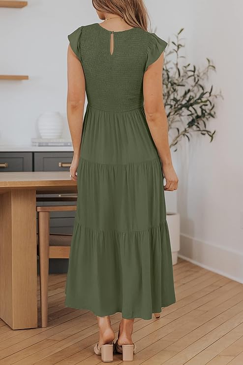 • This striking and blustery midi dress has a complimenting versatile shirred top, includes a group neck, strong variety, high midsection, short cap sleeves, edged with perky ruffles at shoulder, back key-opening conclusion and a flowy layered midi skirt, adds more female.